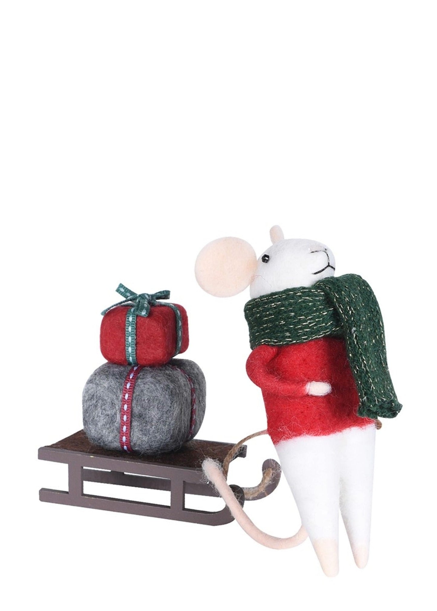 This delightful festive ornament captures the spirit of Christmas with its appealing design. Featuring a charming mouse character complete with a miniature sleigh and presents, it's crafted from a blend of wool, polyester, foam, and wire. Standing at approximately 120mm, it's the perfect size to display on mantels, shelves, or incorporate into festive table arrangements. Its handcrafted aesthetic brings warmth and personality to your Christmas décor, making it an ideal keepsake for collectors or a thoughtful gift for those who appreciate festive charm.